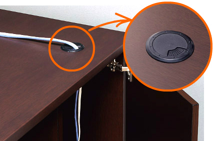 天板奥コーナーにコードホール左右2個付き ホール下は開閉式の背面でメンテナンスも容易 |